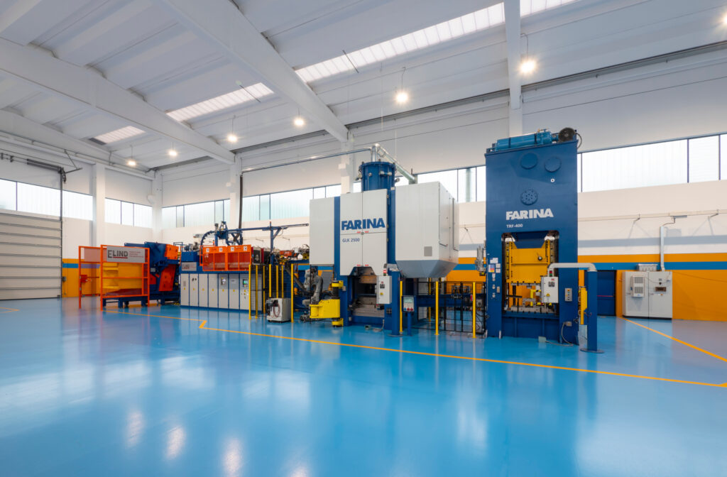C.I.S.L.A. has now put this new forging line from Farina into operation. It consists of a GLK 2500 forging press and a TRF 400 trimming press. The first unit has a press force of 2,500 tons and utilizes the KERS technology (Kinetic Energy Recovery System). A torque motor is used to start the press stroke by driving the eccentric shaft. The flywheel is connected just before forging – when the speed of the eccentric shaft and flywheel are synchronous – by driving the clutch. This way, the energy of the flywheel can be used entirely for the forging process. The energy released during the braking process is used to accelerate the flywheel. Marco Gritti, CEO of Farina, explains: “Additionally, two robots are integrated into the forging line. The first robot is used for billet loading while the second one is used for die lubrication.”