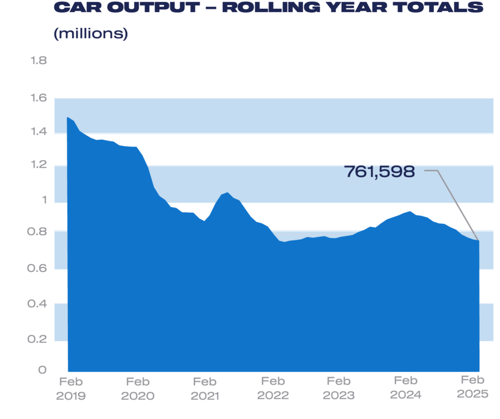 - Car output falls for 12th month in a row, down -7.6% to 73,814 units, with CV volumes declining -35.9% to 8,364 units.