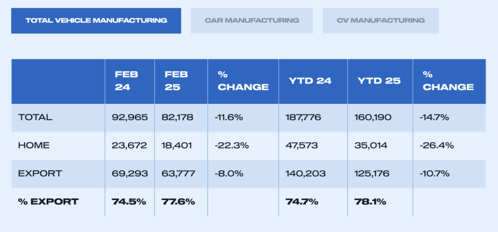 UK car and commercial vehicle production declined -11.6% in February, to 82,178 units, according to the latest figures released today by the Society of Motor Manufacturers and Traders (SMMT). Manufacturers turned out 10,787 fewer cars, vans, trucks, taxis, buses and coaches than in February the year before, with multiple factors at play, notably soft markets at home and overseas, model changeovers and plant restructuring.