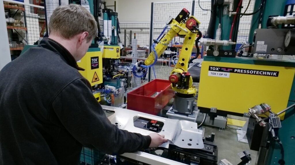With the arrival of a new vehicle concept, DForce’s client Sertec sought two complete automation cells for the self-pierce riveting (SPR) and self-pierce studding (SPS) of aluminium underbody components as four complete sub-assemblies for its UK automotive production line. At the heart of each cell was a FANUC robot.