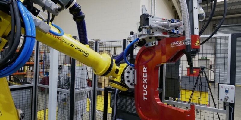 The first cell comprises two manual loading and unloading stations, each working seamlessly with a FANUC R2000iC robot. On one side, two assembly stations fix together both two and three components, a process requiring self-pierce rivets of two differing lengths and studs. The robot specified here – an R2000iC/210F – has a 210kg Stanley Tucker dual-feed rivet gun attached and can accurately identify both the correct part and rivets.