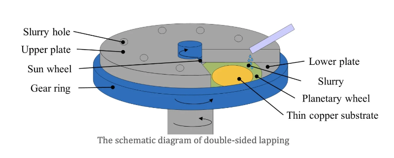 The double-sided lapping setup includes an upper lapping plate (always floating rather than rigid coupling), a lower lapping plate, sun wheel and gear ring. By placing the parts in a carrier and using rotation and pressure the material can be reduced. The universal wheels revolve around the sun wheel and the slurry is dropped from the holes on the upper plate while processing. As a result, both surfaces can be lapped at the same time, so the two surfaces are similar on profile, residual stress, surface roughness and subsurface defects.
