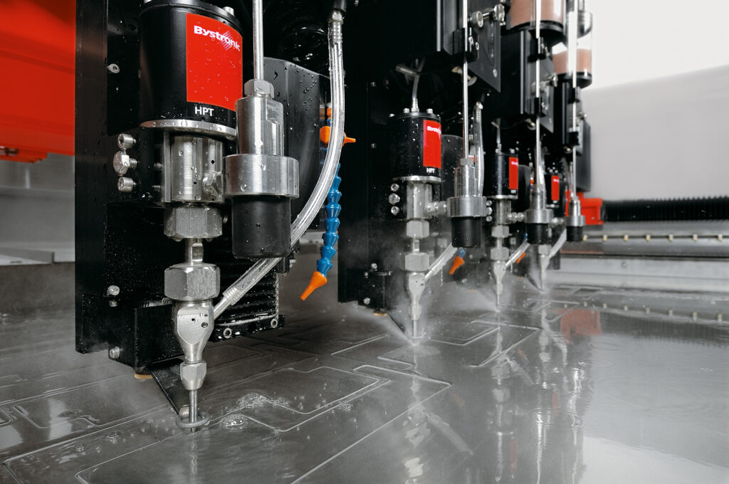 So how does it work? Waterjet Cutting is an accelerated manufacturing erosion process within a material. Highly pressurised water is fired, through a ruby or diamond nozzle, into a mixing chamber. This pressure creates a vacuum, drawing in garnet into the stream, where it is then fired at an object in place for cutting. This all happens while still boasting ultra-fine precision.