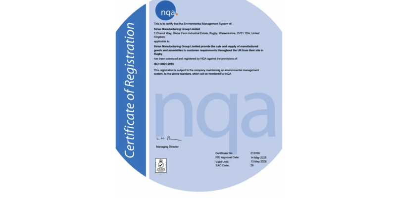 Sirius Manufacturing Group has officially achieved ISO 14001 certification, accredited by NQA. This international standard reflects a commitment to strong environmental management practices and responsible manufacturing.