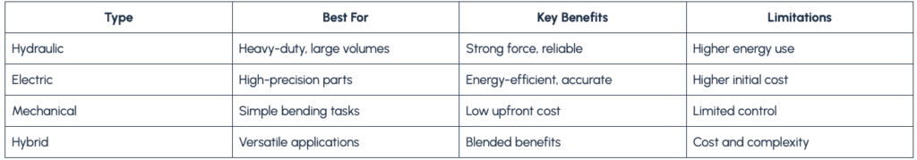 Electric models driven by servo motors offer high precision, high accuracy, and strong energy efficiency for accurate bending. Hydraulic systems remain the workhorse for heavy sections, while a mechanical press brake is effective for simpler parts and stable cycles. Hybrid platforms blend both to balance speed and control.