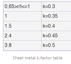 Sheet metal k-factor table