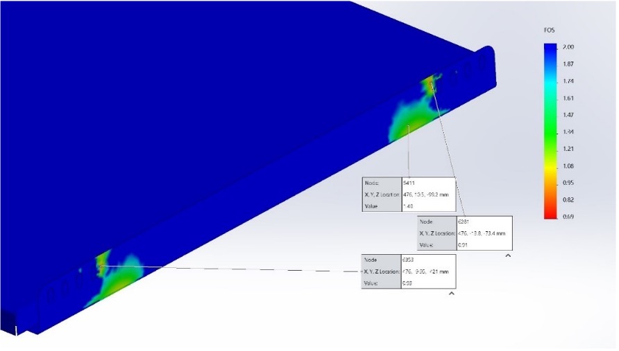 “As customers request further testing and information regarding their products safety and service life, FEA testing could not come at a better time. When using the software on bracketry prototypes, we can test the fixings & bolts that will attach the bracket, the maximum load bearing on the bracket, and the lifespan of the product, using fatigue testing. If you look at the photo on the right, you can see how the software has allowed us to see that this particular bracket, would not be able to hold the required weight needed. The green indicates that over time, the area around the bolts and fixings, would begin to fatigue. To counter this, we communicated with the customer, and informed them that the thickness of metal they were trying to use, in this case 2mm Stainless Steel, would not be fit for purpose. Instead, we opted to use 3mm, which ensured the bracketry of the shelf, met all requirements.”