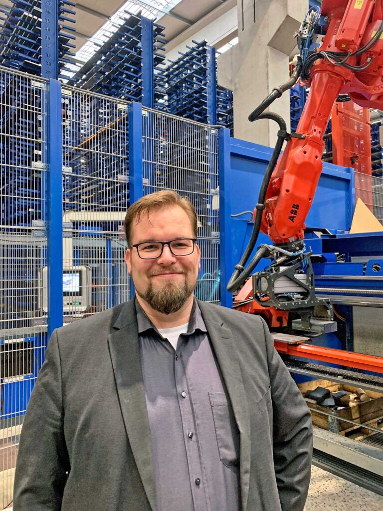 Adjacent to the circular saw, a KASTOsort robot is responsible for cut piece container management. The robot recognises the containers, which already contain the relevant delivery label, and loads the required parts into them automatically, even unattended over the weekend.