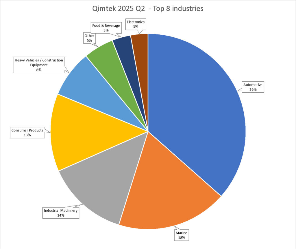 Automotive leapt into pole position as the largest market – an astonishing 90,000% jump from what had been a very low Q1. It was worth almost twice as much as the second largest market, Marine.