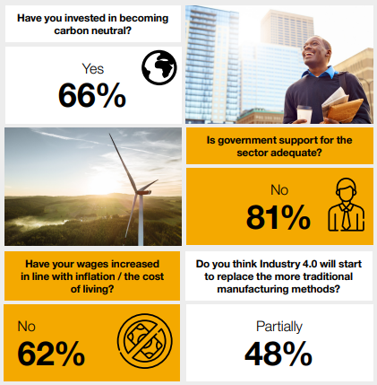 Our results show that just 10% of respondents see working capital/cash as a main barrier to growth in the next 12 months. When considering energy, it’s encouraging to note that 66% of respondents had already invested in working towards carbon neutral.