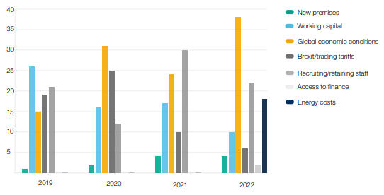 While manufacturing only officially represents about 10% of GDP, its relatively well paid workforce (just 38% of respondents, compared to 47% in 2020, considered the minimum wage an issue for their business), indirectly supports much of the service based sectors, such as banking and finance, retail, hospitality and leisure. Its impact has a magnifying effect on the overall GDP of the UK.