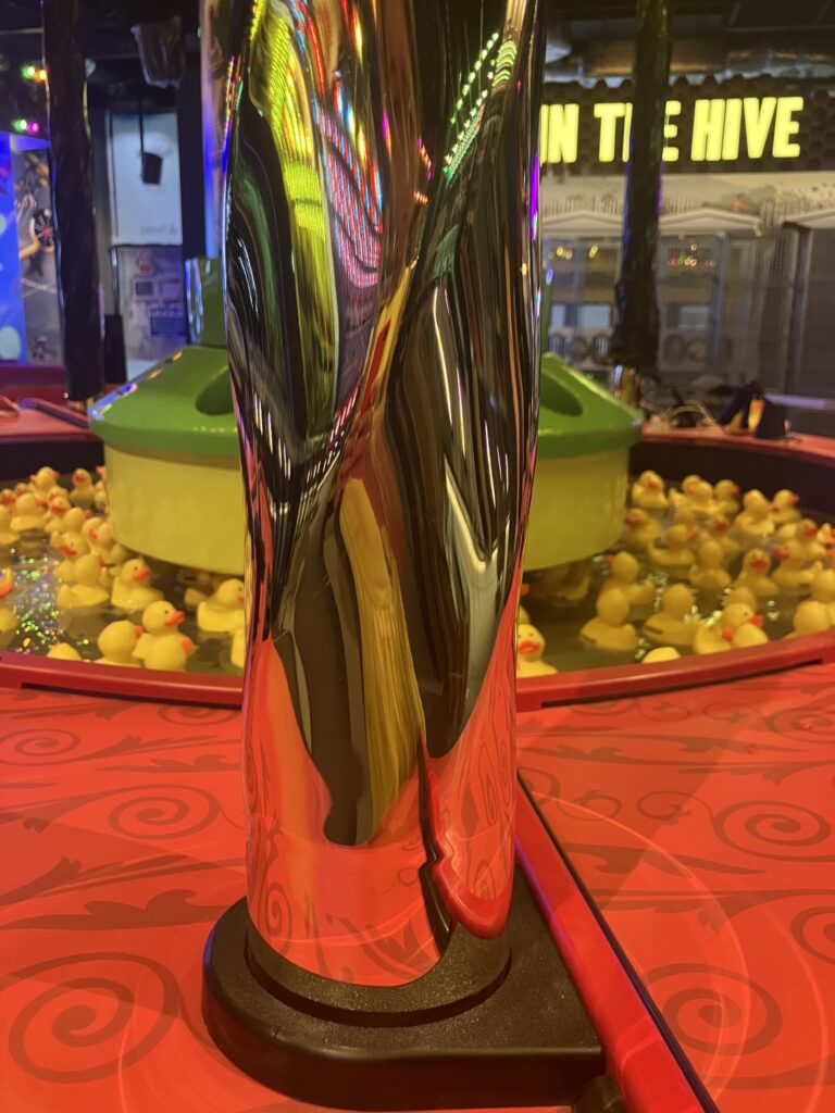 Like the original Fairgame venue in Canary Wharf, the sister venue features twisted brass tubing handrail as specified by Patrick McKinney from A.M.P architectural practice. But in addition to the carousel-style handrails, a new size of brass tube was formed especially for shiny new fairground centrepiece, Beaky Finders: the world’s largest indoor ‘hook-a-duck’ attraction.