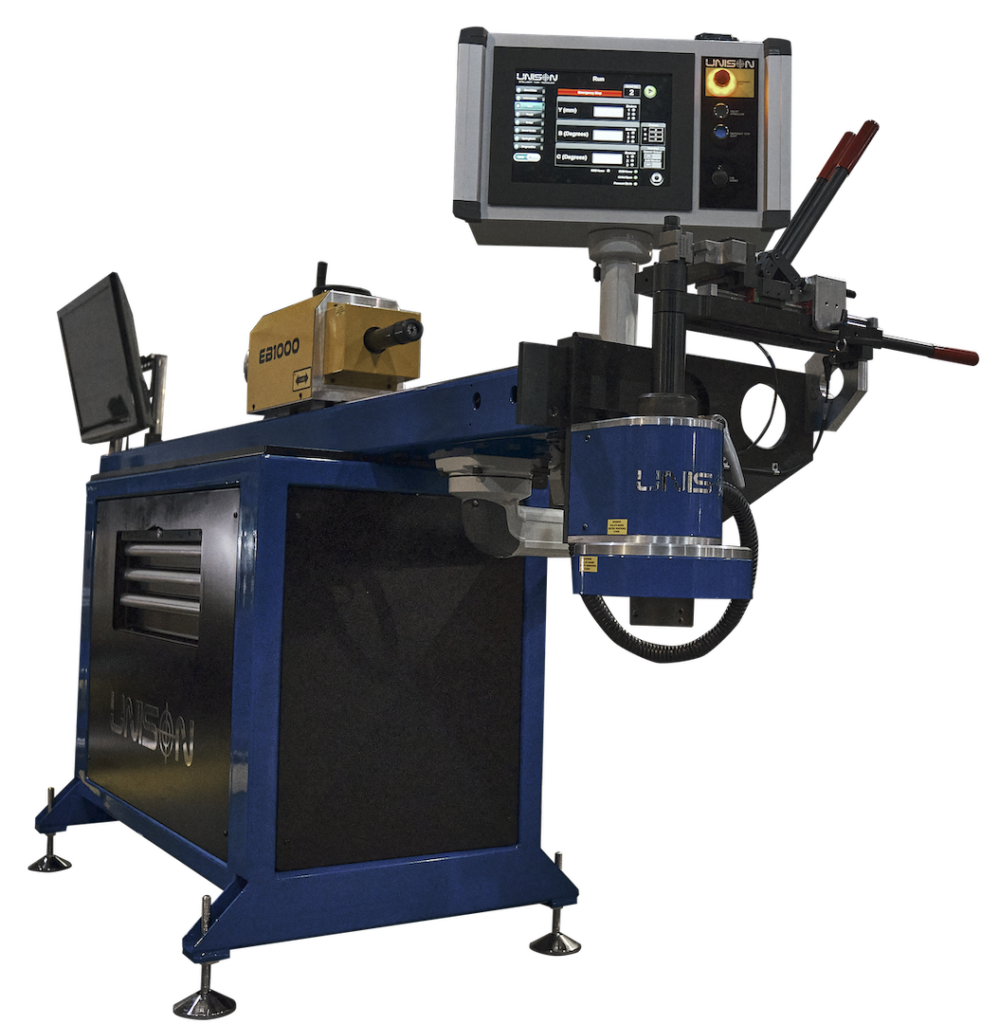 Unison’s EvBend 1000 is a high-precision 3-axis machine that was developed to reduce the entry cost to precision rotary draw tube bending. The machine combines manually operated feed, tube rotation and bending force, with CNC-controlled braking on the carriage feed, rotation and bend arm axes. Typically used for low volume, high-accuracy production and prototyping, Unison EvBend machines offer accurate multi-plane bending at a much lower cost than many CNC benders. Two models are currently available – the EvBend 1000 for bending tube of up to 16 mm in diameter, and the EvBend 2000, a machine featuring power-assisted operation and capable of bending tube of up to 50 mm in diameter. The EvBend CNC control includes a PC-based 15” touchscreen and is capable of processing up to 100 bends per component.