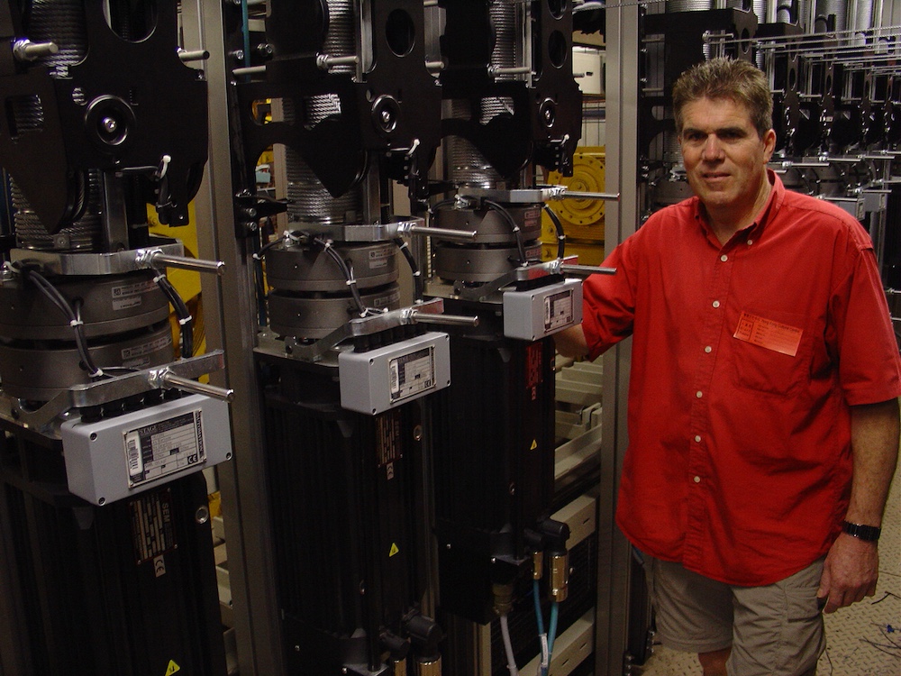 Warren’s early success came in the theatre and stage industry, with bespoke winches and automation systems taking Richard and his team as far as the United States. This vintage photo shows Richard hard at work in America – a snapshot of Warren’s hands-on origins and global ambition.