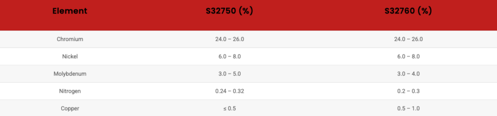 Key Difference: S32760 includes copper (0.5–1.0%), which improves its resistance to certain acids (especially sulfuric) and helps prevent localised corrosion.