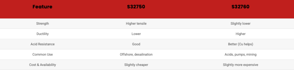 If you’re picking between the two, the choice often comes down to specific environmental requirements. If you’re dealing with acidic or reducing environments, S32760 might be worth the extra cost. Otherwise, S32750 is an excellent, slightly stronger alternative.